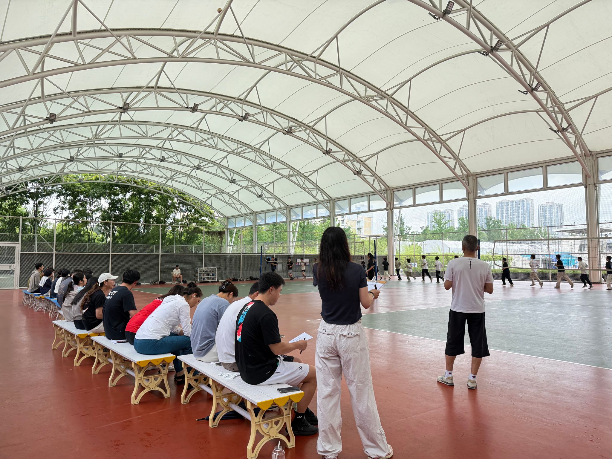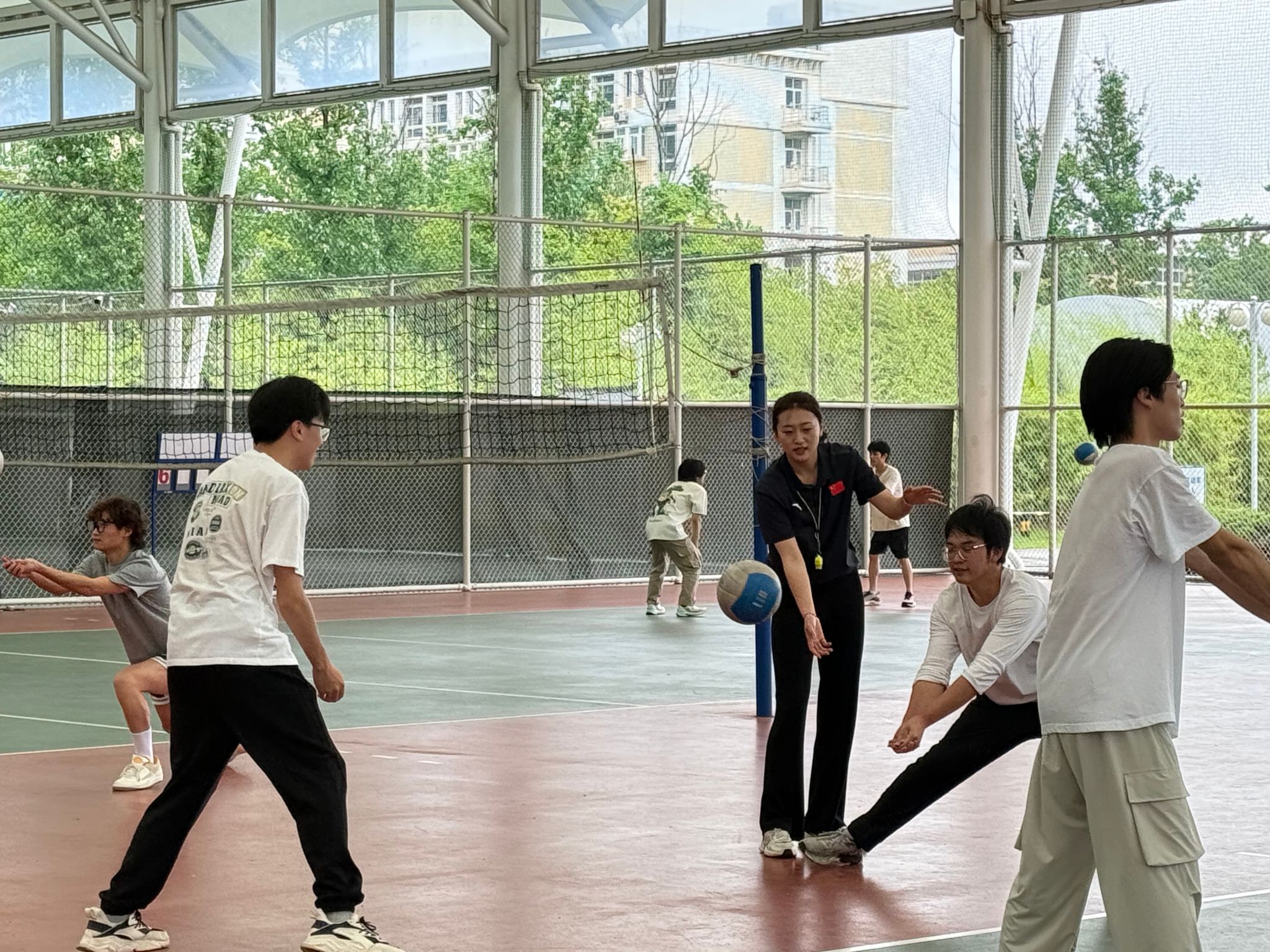 在教学技能展示环节,周蓉老师于风雨球场带来“排球双手正面垫球技术”示范公开课。课堂以“分解教学+动态矫正”为核心,周老师先通过慢动作分解示范、“插臂夹肘提肩蹬地”口诀提炼,将复杂动作要领转化为清晰记忆点。实践环节创新采用“双轨指导”模式:学生两两分组互练互助,同时教师巡回指导,针对击球手型、发力角度等高频问题进行个性化纠正。课程巧妙融入体能循环训练,将专项排球技能提升与学生体质健康水平提升深度融合,充分彰显“做中学”的职教特色。