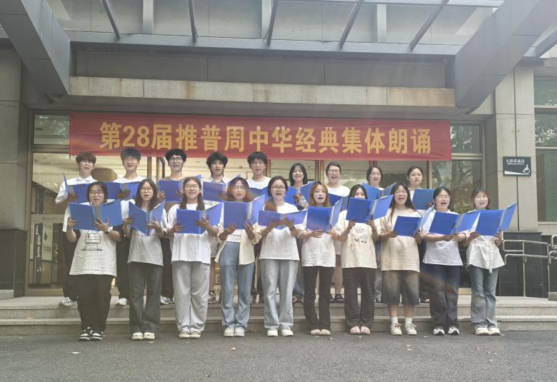 在学生活动中心北门,主持队的同学们集体朗诵中华经典诗文。