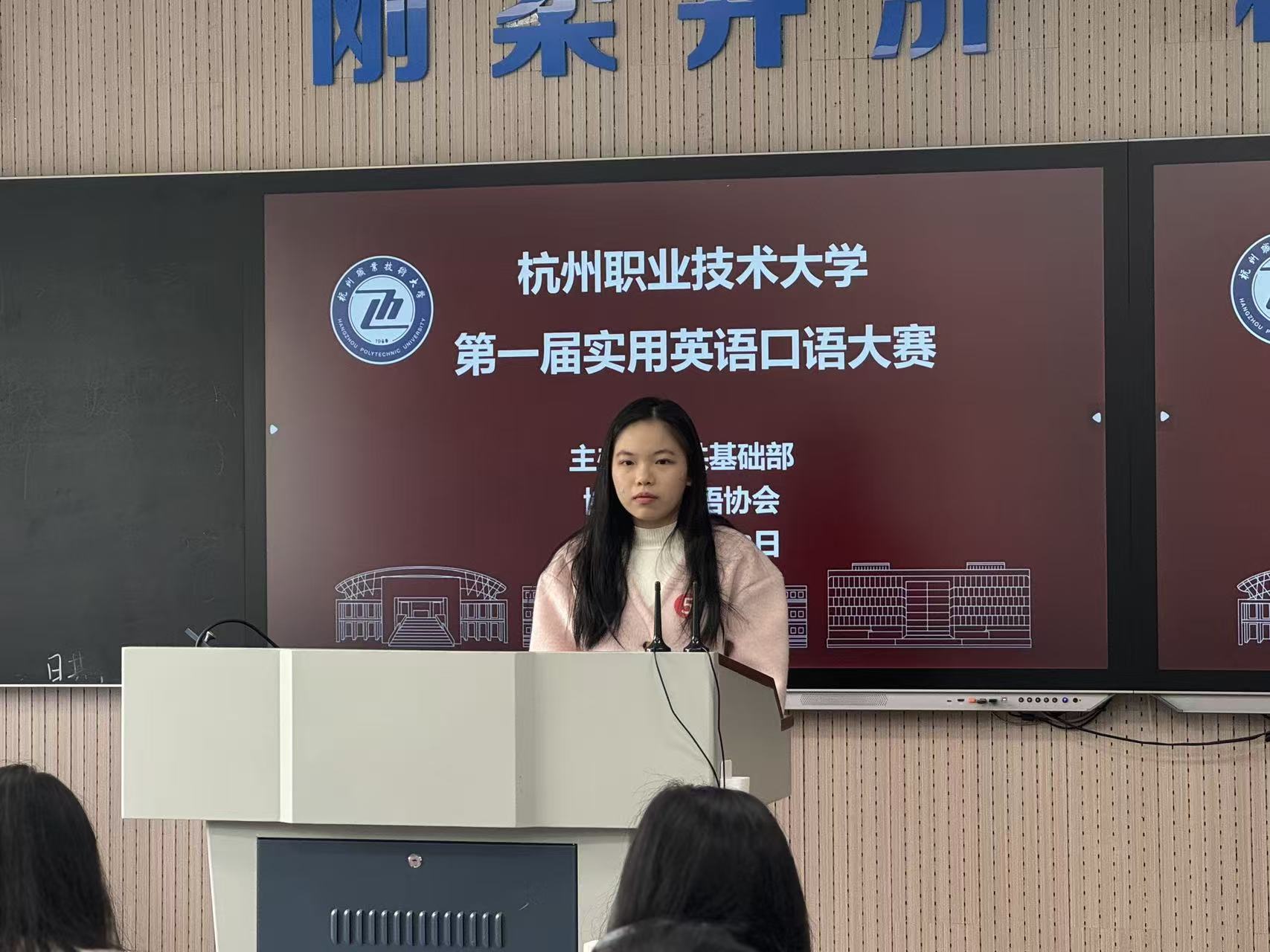 2025 年 11 月 12 日下午,杭州职业技术大学第一届实用英语口语大赛决赛在1304教室正式拉开帷幕。本届大赛由公共基础部主办、校英语协会协办,旨在打破传统英语学习的壁垒,将语言运用与未来职场场景深度融合,为学生提供一个切磋职场英语技能、展示职场英语素养的平台。